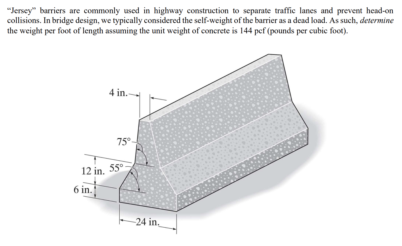 Use unit weight of 144 lbft3. 42-inch 110 cm-high variation of the Jersey barrier known as an Ontario Tall Wall used to deflect vehicles from crossing into the opposing lanes of traffic.